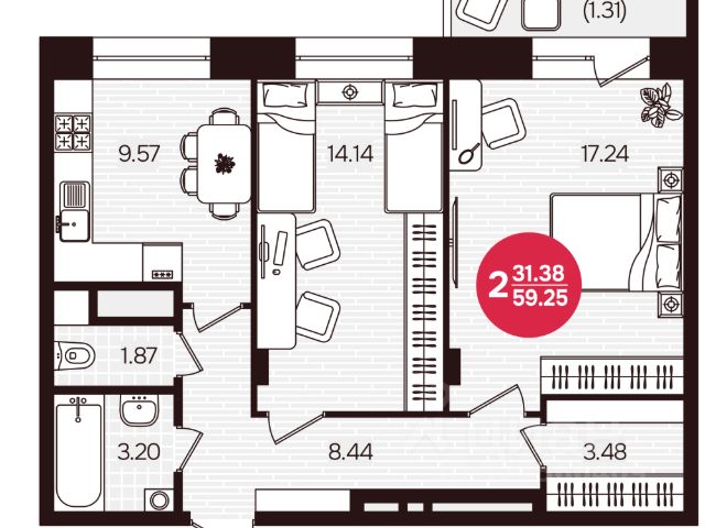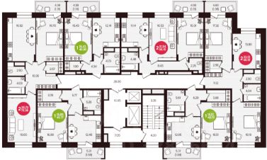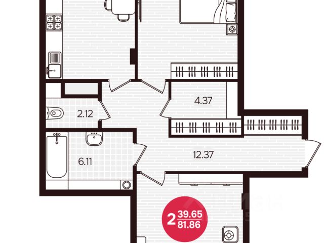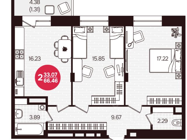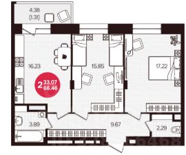 Общая площадь квартиры составляет 65,2 кв.м, две комнаты 10 и 18 кв.м, кухня 10 кв.м, прихожая 12 кв.м, ванная 4,5 кв.м, туалет 2,5 кв.м., лоджия 4,5 кв.м., балкон 2,5 кв.м.