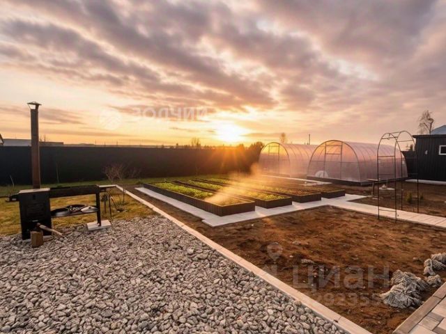 Сад с плодоносящими деревьями,теплица,есть специальное места для выращивания бройлерных кур. 2 заезда для машин. Спереди дома плодовые рябины,боярышник,газонная трава,туи,ели.