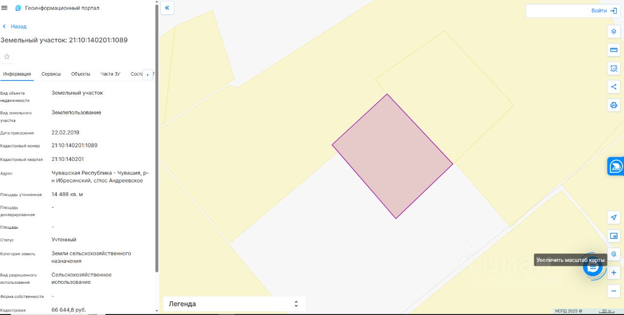 Земельный участок с кадастровым номером 21:10:140201:1089 площадью 14488 кв.м., расположенного по адресу: Чувашская Республика-Чувашия, р-н Ибресинский, с/пос. Андреевское, категория земель: земли сельскохозяйственного назначения, разрешенное использование: сельскохозяйственное использование.