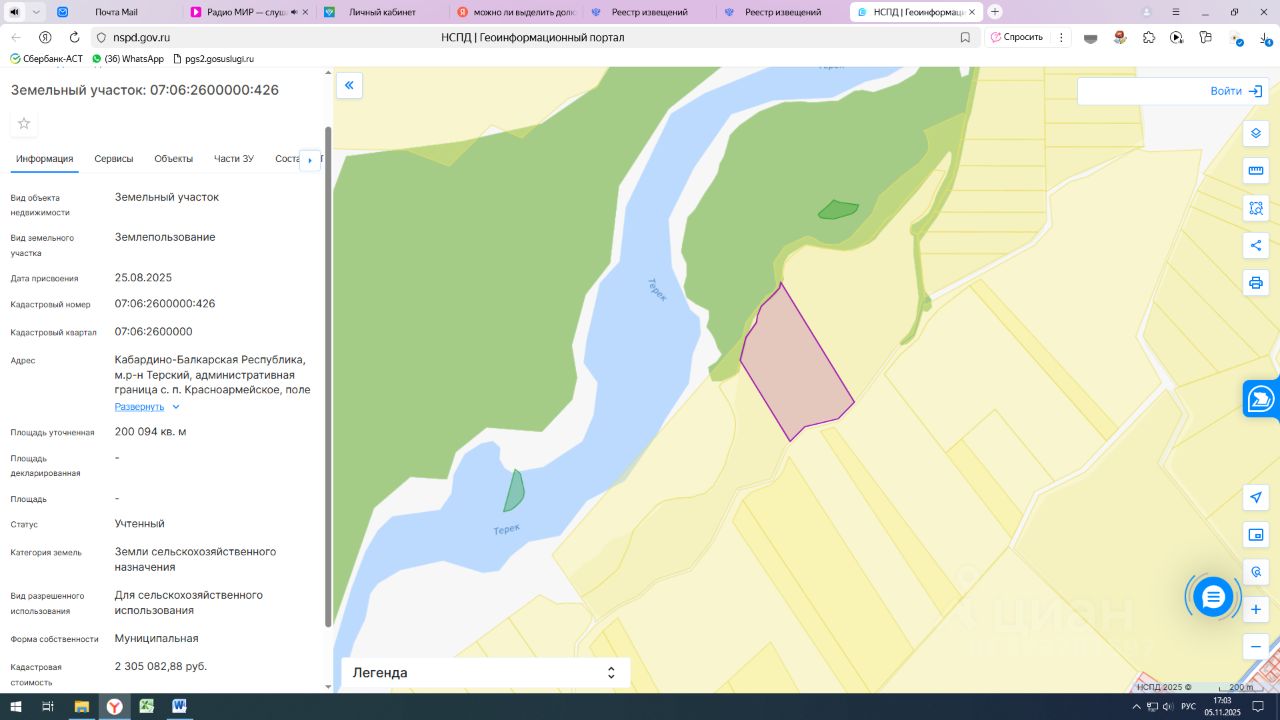 Земельный участок с кадастровым номером 07:06:2600000:426 площадь 200094 по адресу Кабардино-Балкарская Республика, м.р-н Терский, административная граница с. п. Красноармейское, поле 24/8-5