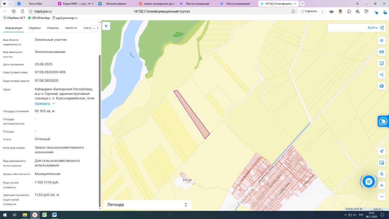 Земельный участок с кадастровым номером 07:06:2600000:406 площадь 95505 по адресу Кабардино-Балкарская Республика, м.р-н Терский, административная граница с. п. Красноармейское, поле 132-6