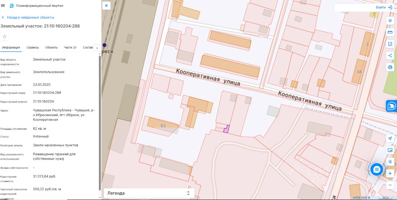 Земельный участок с кадастровым номером 21:10:160204:288 площадью 62 кв.м., расположенного по адресу: Чувашская Республика-Чувашия, р-н Ибресинский, пгт. Ибреси, ул. Кооперативная, категория земель: земли населенных пунктов, разрешенное использование: размещение гаражей для собственных нужд