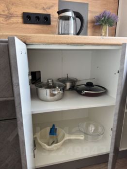 Холодильник, микроволновка, чайник, варочная плита, посуда для приготовления и еды