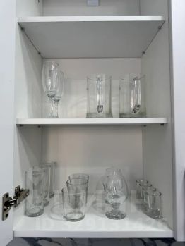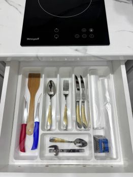 полностью оборудованная кухонная зона: холодильник, варочная панель, микроволновая печь, электрический чайник, вся необходимая посуда и столовые приборы, набор продуктов (чай, кофе, сахар, соль, специи)