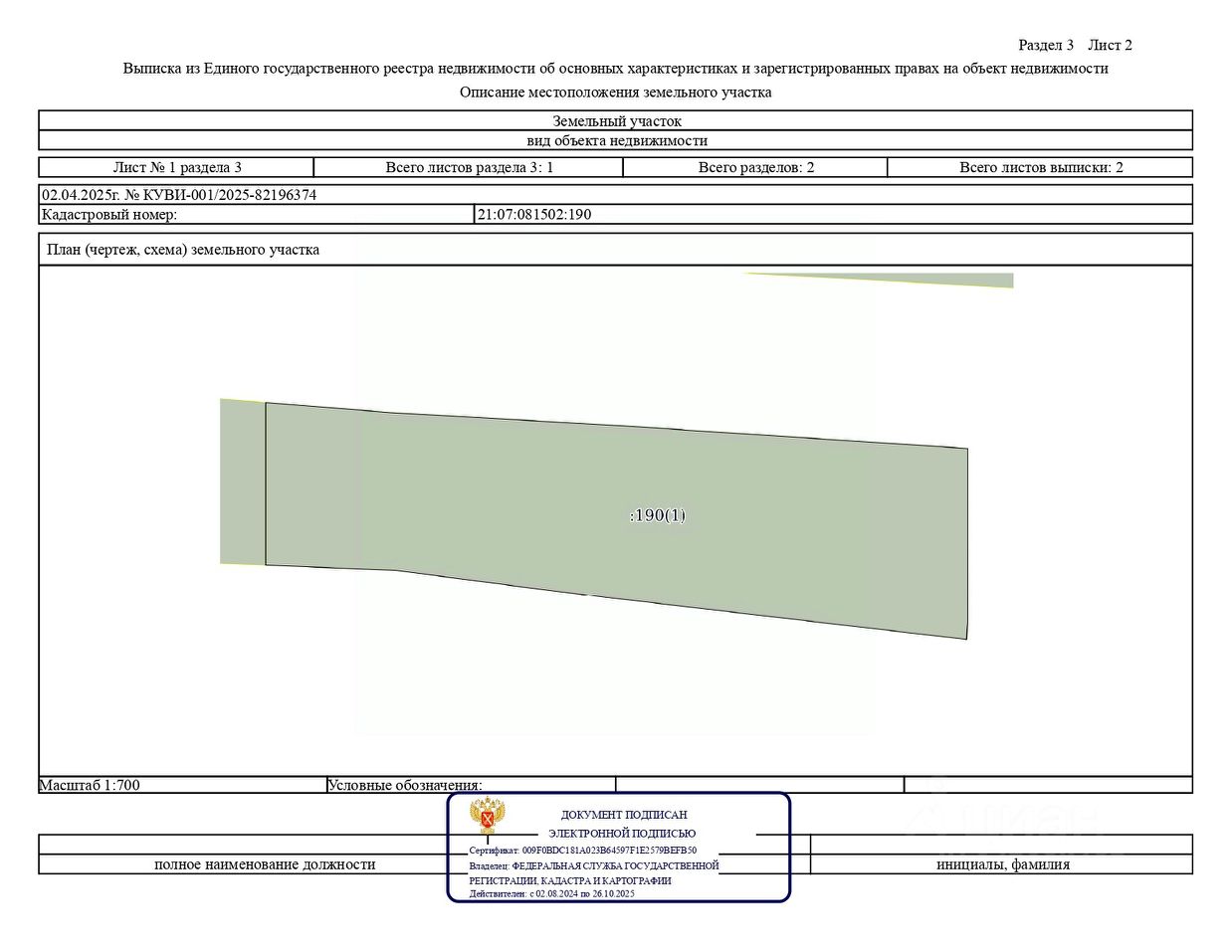 из земель населенных пунктов, с кадастровым номером 21:07:081502:190; с видом разрешенного использования "ведение личного подсобного хозяйства (приусадебный земельный участок)", общей площадь 3154 кв.м.