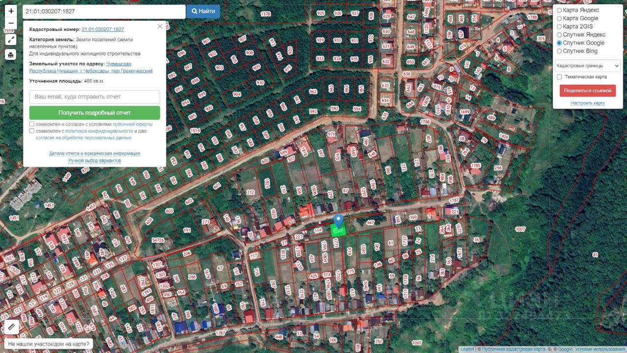 Земельный участок, местоположение: Чувашская Республика Чувашия, г. Чебоксары, пер. Гремячевский, кадастровый номер 21:01:030207:1827, общая площадь: 486 кв. м, разрешенное использование: для индивидуального жилищного строительства