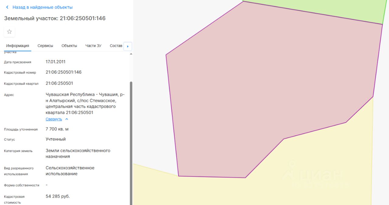 Земельный участок с кадастровым номером 21:06:250501:146 площадью 7700 кв. м., категория земель земли сельскохозяйственного назначения, вид разрешенного использования сельскохозяйственное использование, расположенный по адресу: Чувашская Республика - Чувашия, Алатырский р-н, Стемасское с/пос, центральная часть кадастрового квартала 21:06:250501