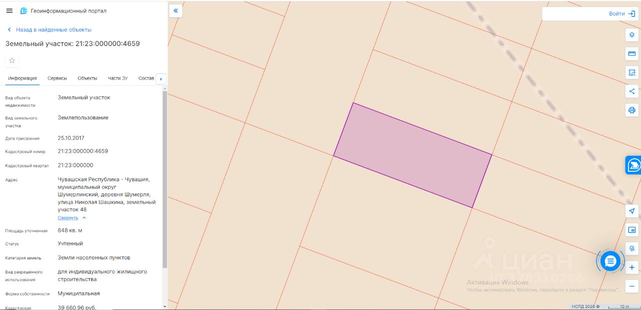Земельный участок, находящийся в муниципальной собственности Шумерлинского муниципального округа Чувашской Республики, с кадастровым номером 21:23:000000:4659, площадью 848 кв.м, имеющий местоположение: Чувашская Республика, Шумерлинский муниципальный округ, деревня Шумерля, улица Николая Шашкина, участок 48, видом разрешенного использования "Для индивидуального жилищного строительства"