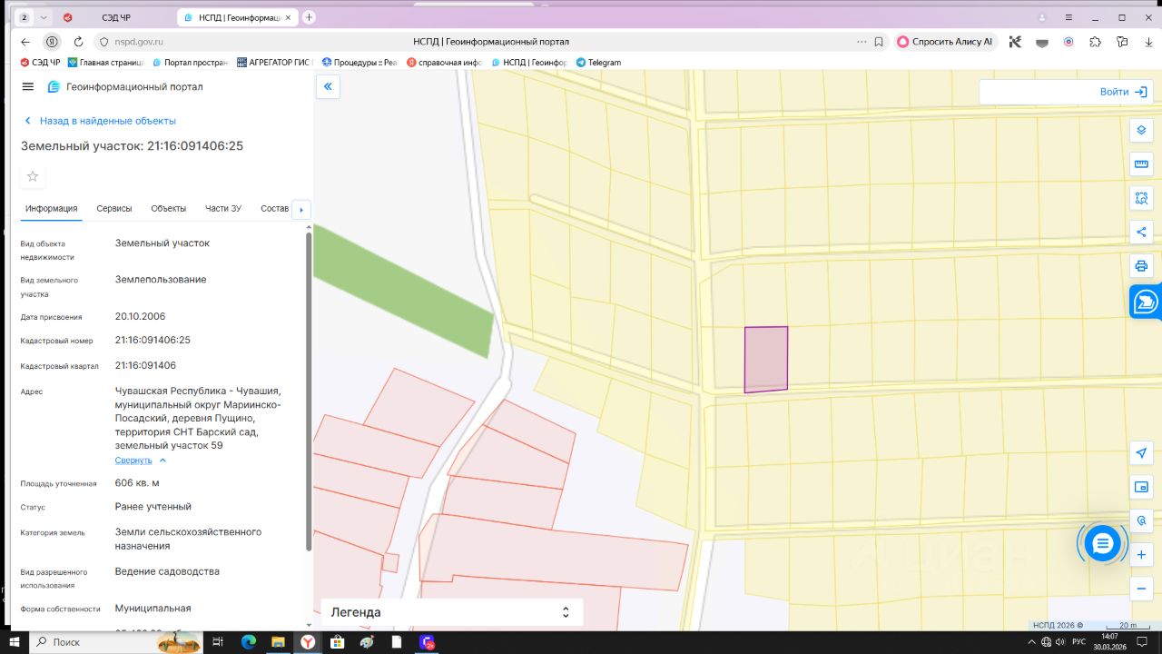 Земельный участок с кадастровым номером 21:16:091406:25, категория земель: земли сельскохозяйственного назначения, вид разрешенного использования: ведение садоводства, общая площадь 606 кв.м. (0,0606 га), расположенный по адресу: Чувашская Республика, Мариинско-Посадский муниципальный округ, садоводческое товарищество "Барский сад", участок 59