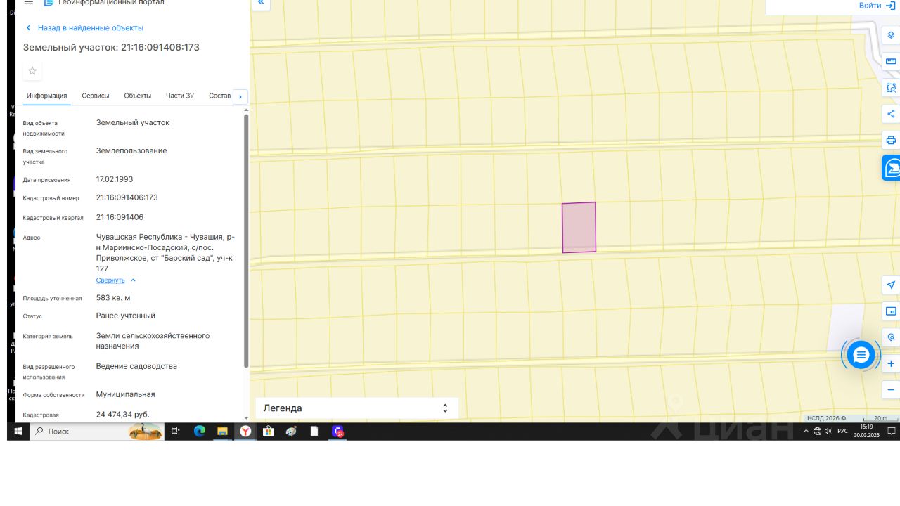Земельный участок с кадастровым номером 21:16:091406:173, категория земель: земли сельскохозяйственного назначения, вид разрешенного использования: ведение садоводства, общая площадь 583 кв.м. (0,0583 га), расположенный по адресу: Чувашская Республика, Мариинско-Посадский муниципальный округ, садоводческое товарищество "Барский сад", участок 127