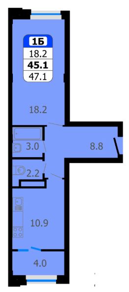 Продаётся 1-комнатная квартира в строящемся доме (поз.2 блок-секции А,Б), срок сдачи: II-кв. 2026, общей площадью 47.1 кв.м., на 8 этаже.