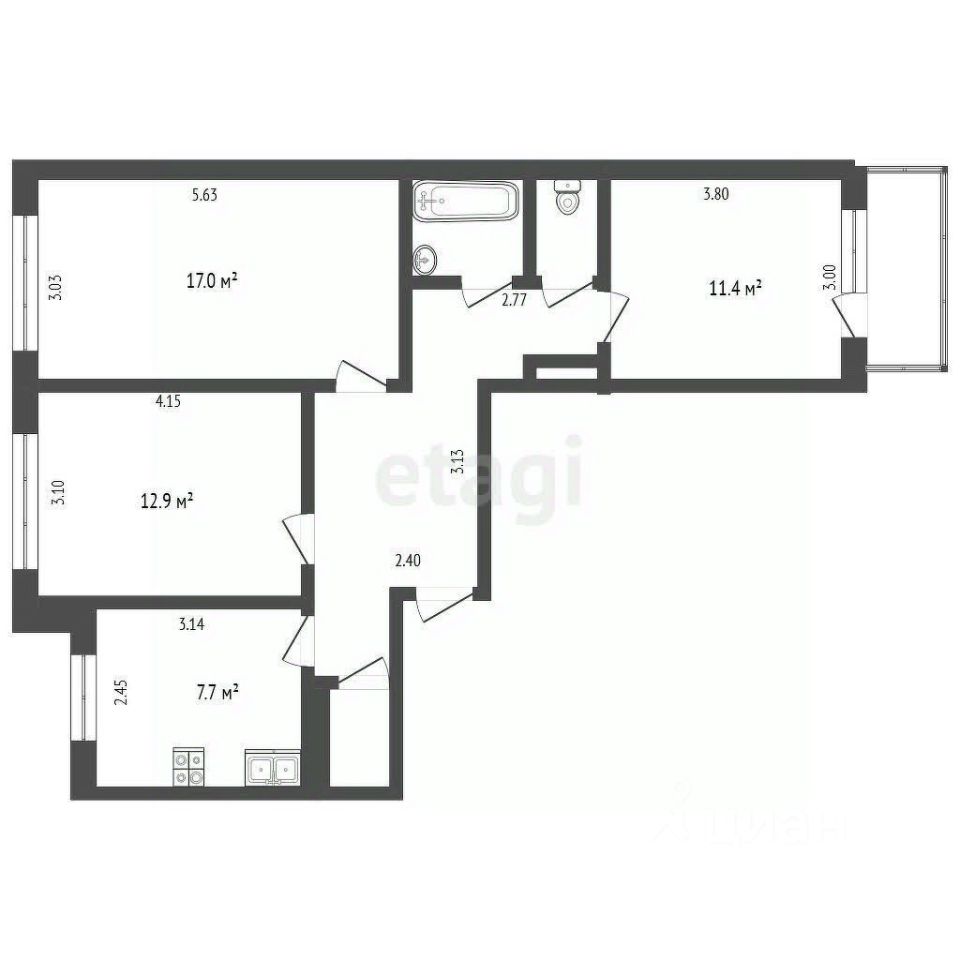 Окна выходят на две стороны, обеспечивая хорошую инсоляцию и проветривание помещений, а большая лоджия добавляет полезного пространства.