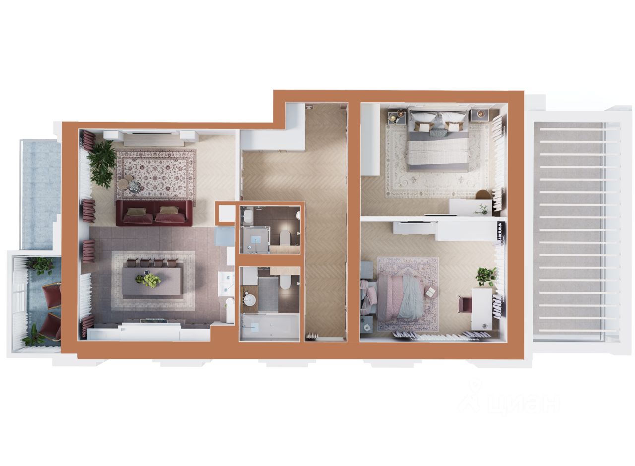 Внутри по 120 квартир, каждая из квартир уникальна за счёт продуманного внутреннего пространства. Просторные кухни-гостиные, обособленные мастер-спальни и открытые террасы из квартир расширяют границы комфорта и подчёркивают индивидуальность.