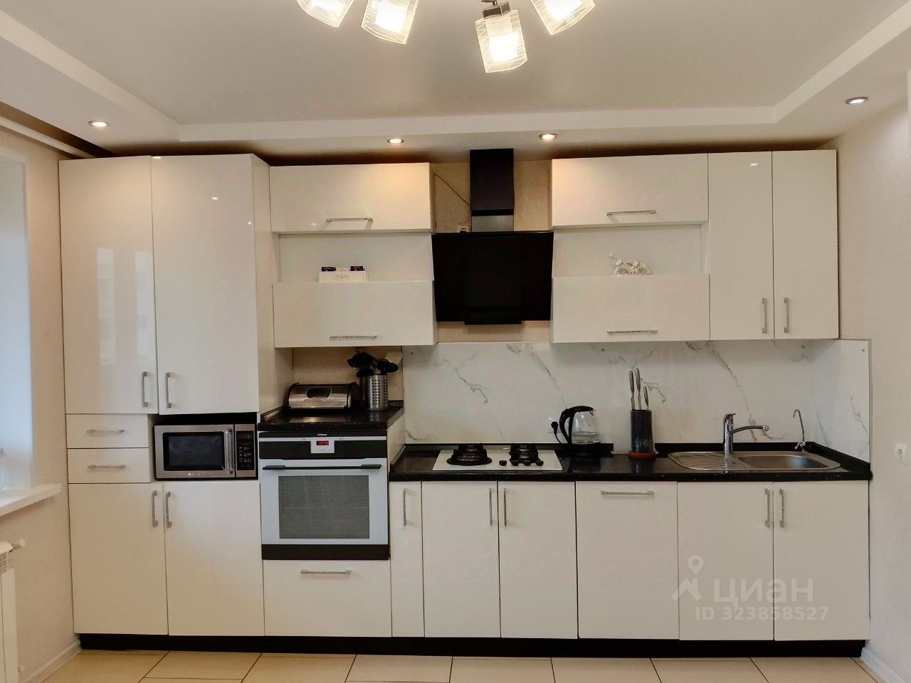 Кухня оснащена современным кухонным гарнитуром с встроенной техникой: газовая варочная поверхность, духовой шкаф, вытяжка, посудомоечная машина.