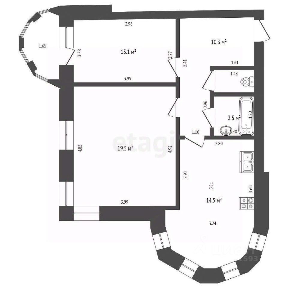 - Две жилые комнаты: 13.1 кв.м. и 19.5 кв.м.