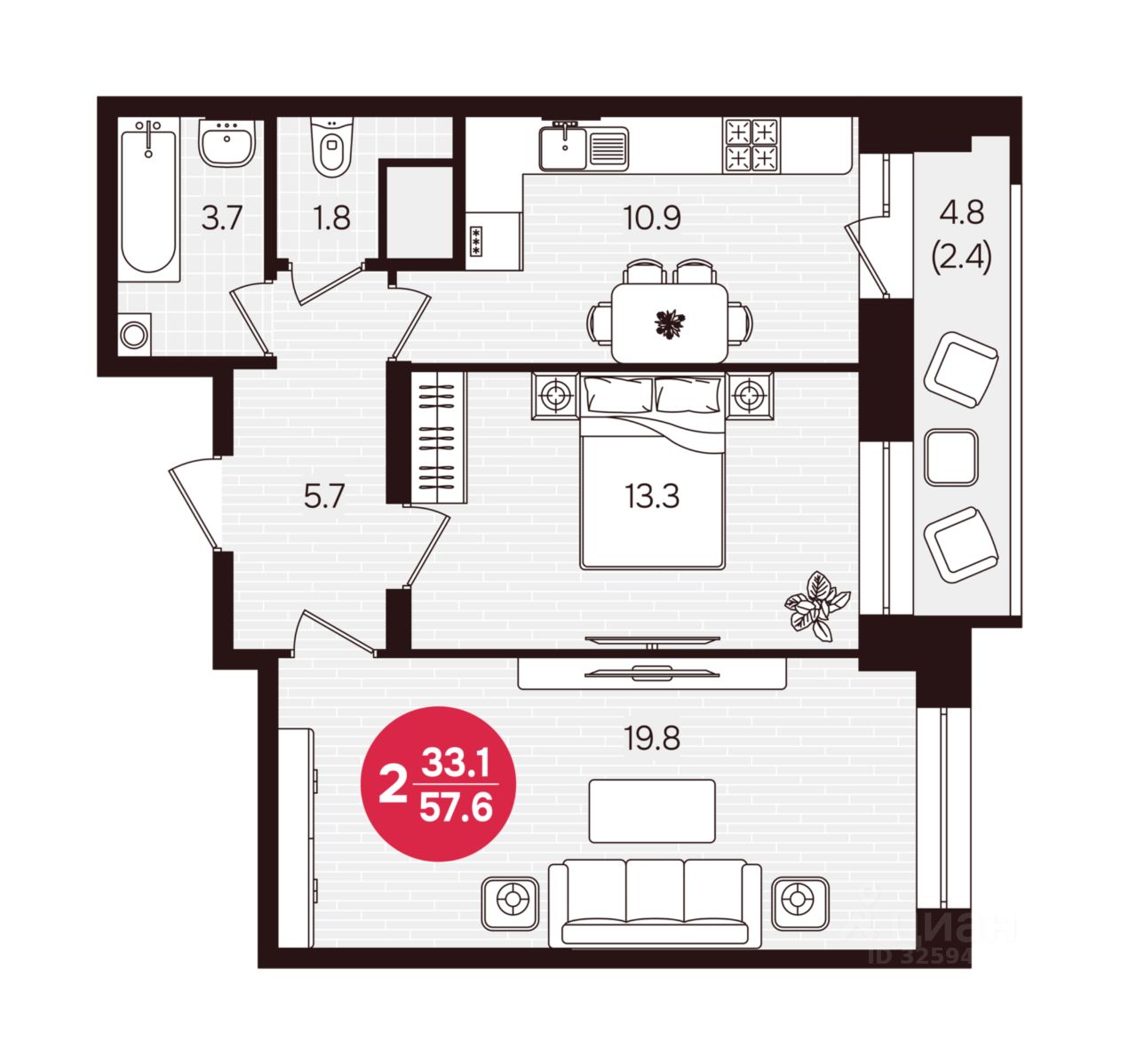 Общая площадь57,6 м²