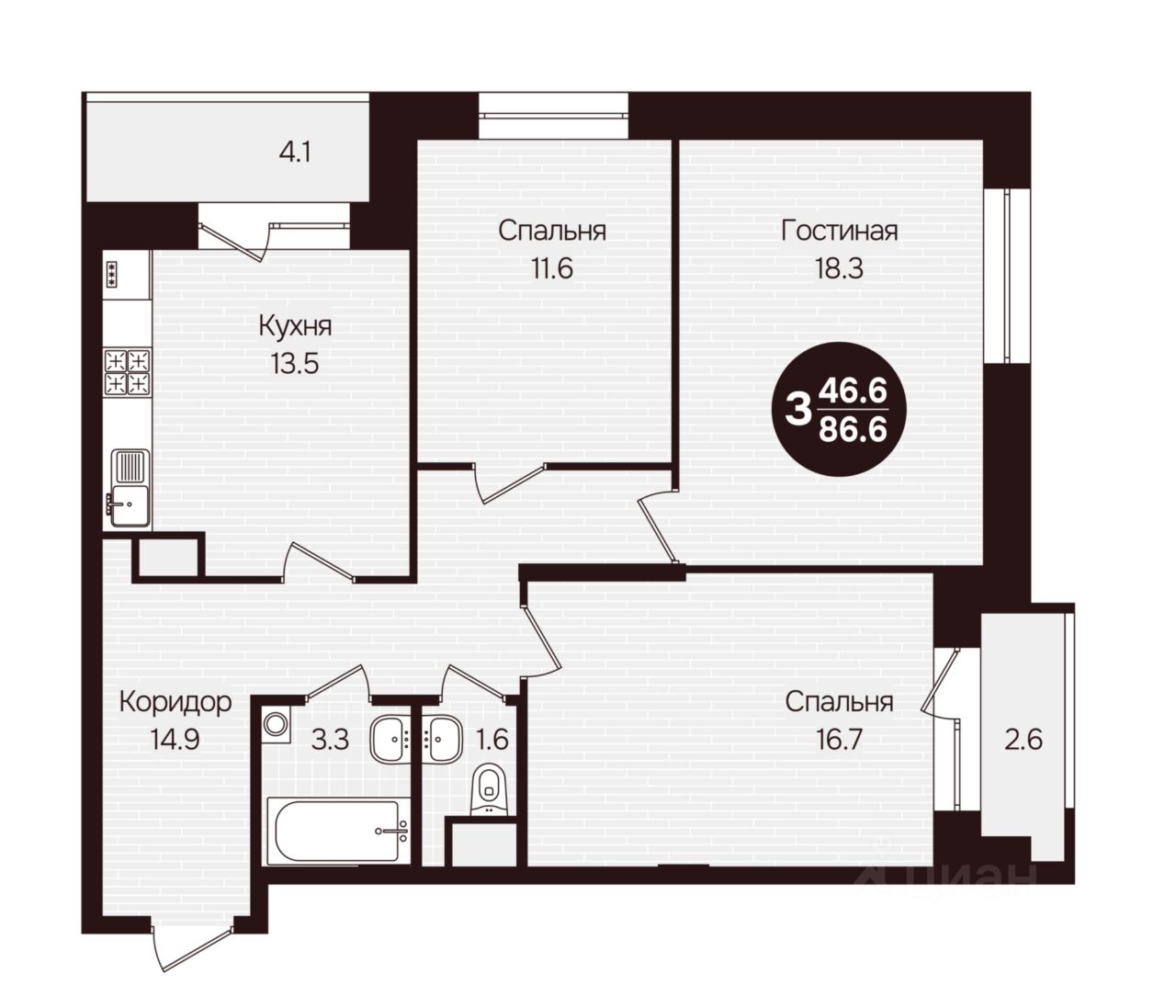 Общая площадь86,6 м²