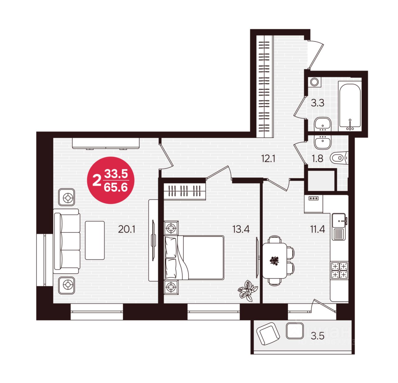 Жилая площадь33,5 м²
