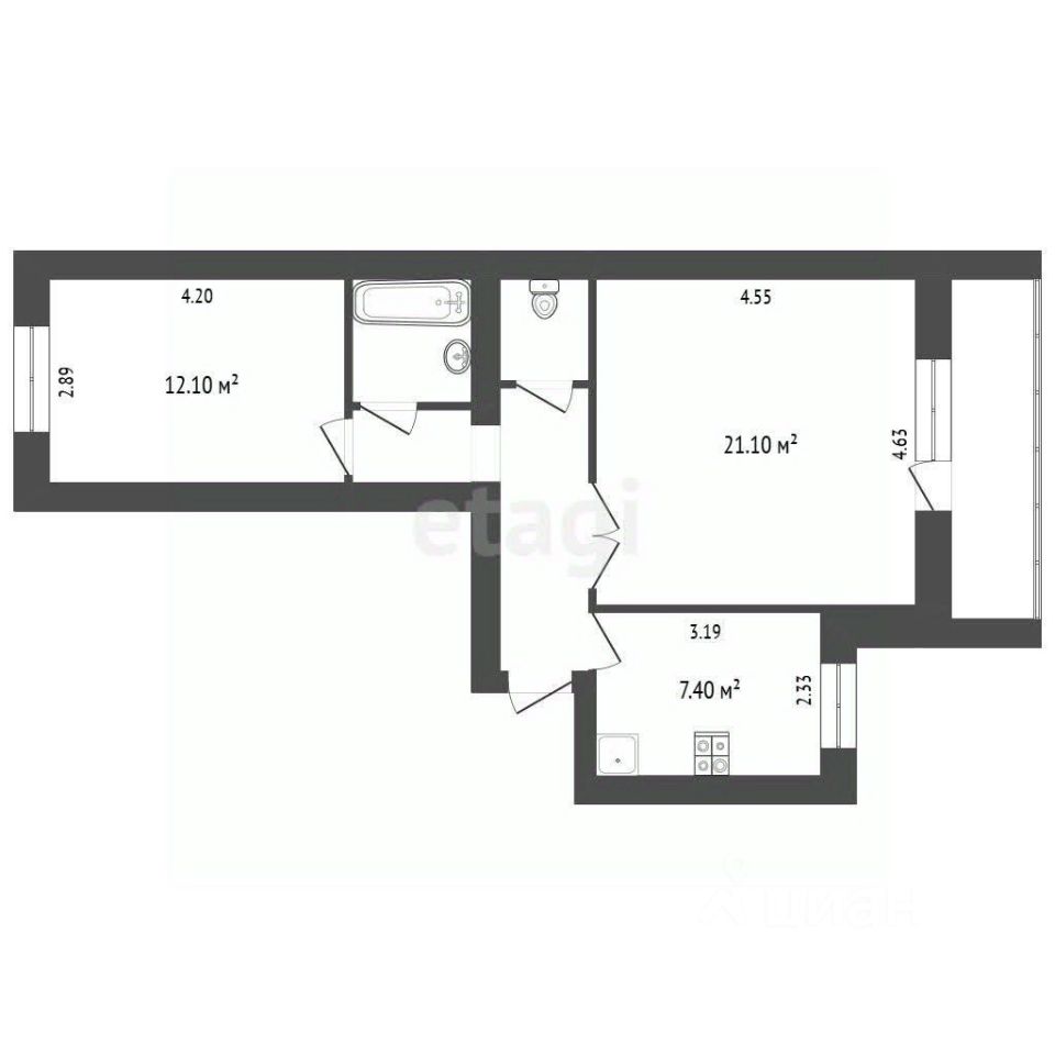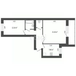 Объект отличается классической и востребованной планировкой "распашонка": изолированные комнаты правильной формы площадью 21,1 кв.м и 12,1 кв.м выходят окнами в разные стороны, обеспечивая приватность и хорошую инсоляцию. Кухня 7,4 кв.м функциональна и позволяет разместить обеденную зону.