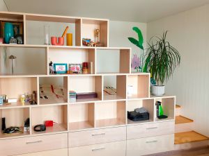 Отдельное преимущество — вместительная гардеробная, которая позволяет не загромождать комнату шкафами и сохранить свободное пространство.