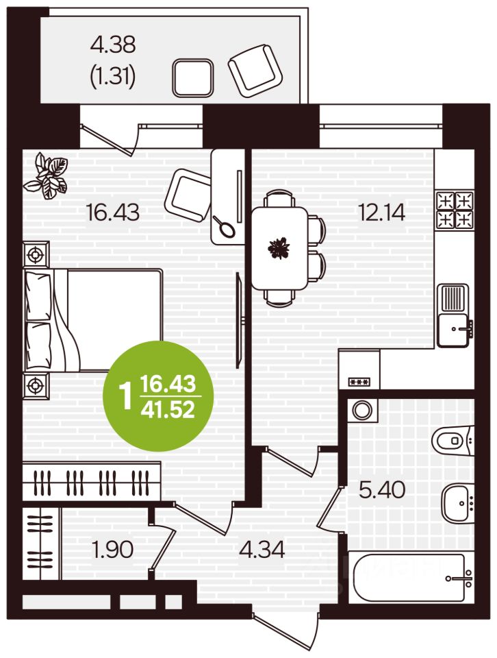 Общая площадь41,52 м²