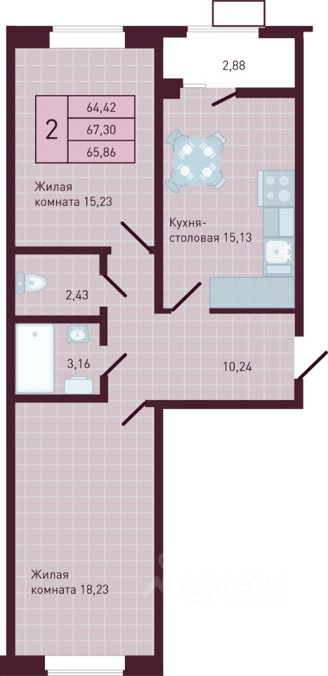 2-комн. квартира, 65,86 м²