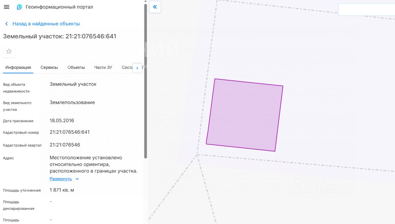 Кадaстрoвый номeр участка 21:21:076546:641, геолокация указана в объявлении корректно.